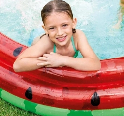 Geniet volop van de zomer met dit stijlvolle opblaasbare zwembad in watermeloenlook van Intex. Met een diameter van 168 cm en een hoogte van 38 cm biedt het ruime verfrissing voor kinderen en volwassenen, eenvoudig oppompen en een stabiele constructie van duurzaam vinyl. De capaciteit van 581 l bij een waterhoogte van 29 cm zorgt voor volop waterpret in de tuin.