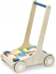 24 blokken in verschillende vormen zijn in de wagen inbegrepen, wat kinderen talloze mogelijkheden biedt voor creatief spel. De loopwagen heeft een modern design met een blauw handvat en witte illustraties.