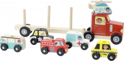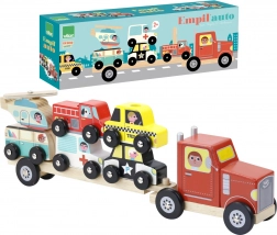 Deze robuuste houten vrachtwagen met afneembare aanhanger is ideaal voor kleine chauffeurs en voertuigliefhebbers. Kinderen kunnen zelfstandig 6 thematische voertuigen laden en lossen en zo hun vaardigheid en logisch denken ontwikkelen. Kleurrijke details en een vriendelijke uitstraling stimuleren fantasierijk spel en helpen kinderen verschillende voertuigen te herkennen.
