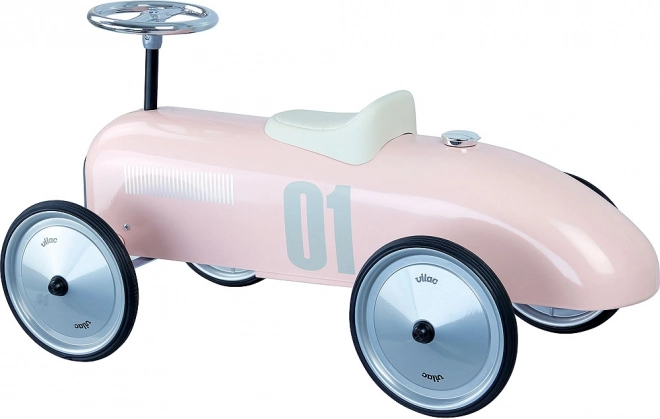 De roze loopfiets is geïnspireerd op klassieke raceauto's en geeft kinderen het gevoel van een echte coureur.