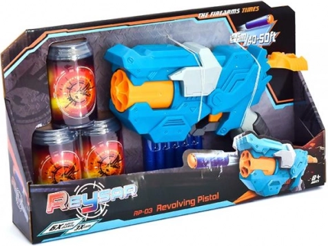 De set bevat drie plastic blikjes die dienen als doelwitten voor het oefenen van het richten, en zes zachte schuimkogels voor veilig spelen. Een perfecte keuze voor thuiswedstrijden in precisie en voor actiespelletjes met teamgenoten.