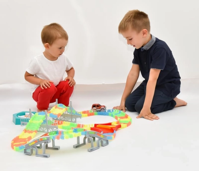 Het lichtgevende effect na belichting verandert de kamer in een stralende racebaan. De set is ideaal voor de ontwikkeling van fijne motoriek, creativiteit en ruimtelijk inzicht. Het autootje wordt aangedreven door een AA-batterij (niet inbegrepen), zodat het plezier extra lang kan duren.