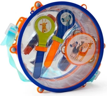 Bevat een trommel met stokken, tamboerijn, maracas, fluit en andere rammelaars – allemaal in levendige kleuren voor speels leren.