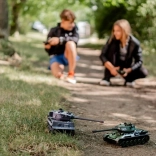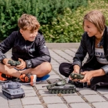 Beide tanks kunnen gelijktijdig rijden zonder signaaloverslag. Vloeiende bediening met sticks voor vooruit/achteruit en nauwkeurig draaien op de plek.