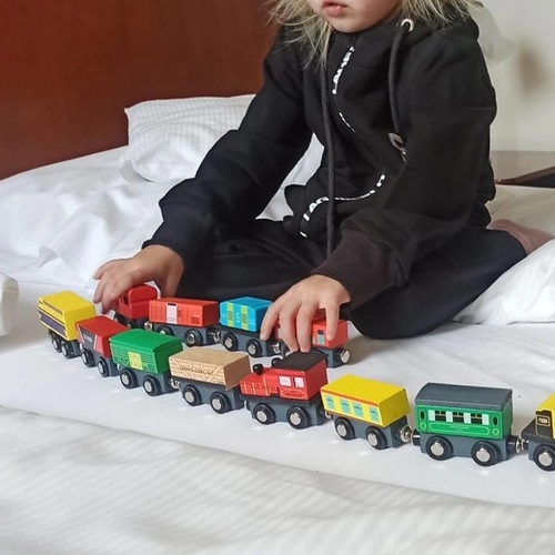 De houten treinbaan leert en vermaakt tegelijkertijd. Het helpt belangrijke vaardigheden te ontwikkelen, zoals visuele stimulatie en ruimtelijk denken.