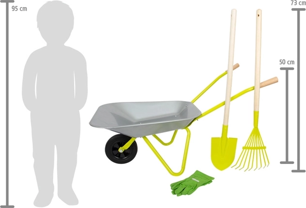 Ideale set voor kleine tuiniers! Deze kinder kruiwagen heeft een capaciteit van ongeveer 10 liter en is uitgerust met katoenen handschoenen, een schep en een hark, waardoor kinderen gemakkelijk kunnen helpen in de tuin.