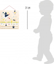 Het multifunctionele leerbord combineert een klok met beweegbare wijzers, een kalender met dagen, maanden en datum, en een overzicht van het weer en de seizoenen. Kinderen trainen zo op een natuurlijke manier hun tijdsoriëntatie en planning, terwijl zij hun fijne motoriek oefenen door de afzonderlijke elementen te verschuiven en in te stellen.