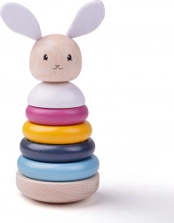 Deze hoogwaardige houten stapelaar in pasteltinten is een ideale eerste educatieve speelgoedset. Kinderen stapelen de ringen van groot naar klein, versterken hun oog-handcoördinatie en leren kleuren en vormen onderscheiden. De stoffen oortjes en staart van het konijntje voegen een tactiele dimensie toe aan het spel.