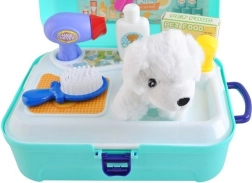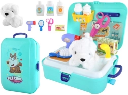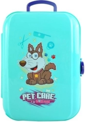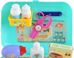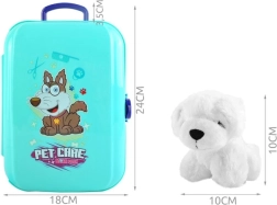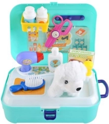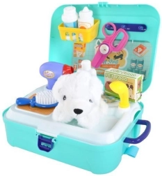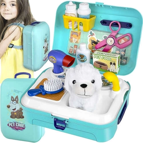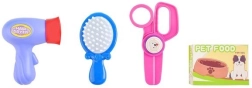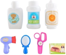 De set bevat gereedschap zoals een borstel, föhn, voedselbak, shampoo en medicijnen, waardoor kinderen creatief kunnen spelen.