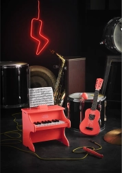 In de verpakking zitten ook een reservesnaar en een plectrum, zodat kinderen meteen kunnen “optreden” in de kinderkamer. Het product is bedoeld als speelgoed – het helpt ritme, gehoor en motoriek te ontwikkelen, maar het is geen echt muziekinstrument.