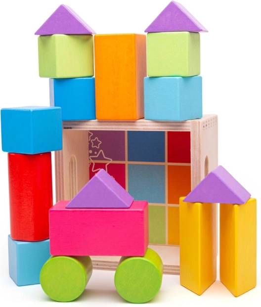 - De set bevat 17 gekleurde blokken in verschillende vormen die de ontwikkeling van behendigheid en oog-handcoördinatie ondersteunen.