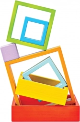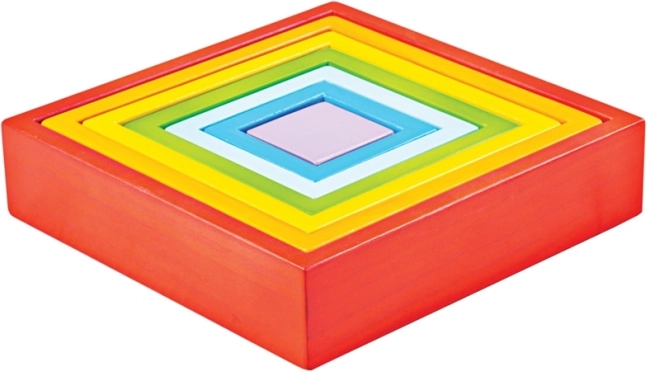 De regenboogkleurige set en geleidelijk kleiner wordende vierkanten helpen kinderen kleuren, maten en vormen te onderscheiden. Ideaal voor de eerste stappen in sorteren en benoemen.