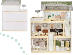 Het poppenhuis heeft drie verdiepingen en een ruim terras, wat voldoende ruimte biedt voor allerlei speelscenario's.