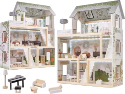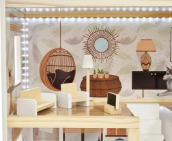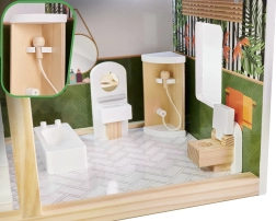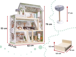 Het houten poppenhuis LULILO Floro is ontworpen in boho-stijl, wat het niet alleen mooi maar ook functioneel maakt. Met zijn drie verdiepingen en het ruime terras biedt het volop ruimte voor verschillende scènes en spelletjes. Het huis is uitgerust met vier kamers: keuken, badkamer, woonkamer en slaapkamer, waarbij elke kamer rijkelijk is ingericht zoals in een echt huis.