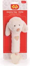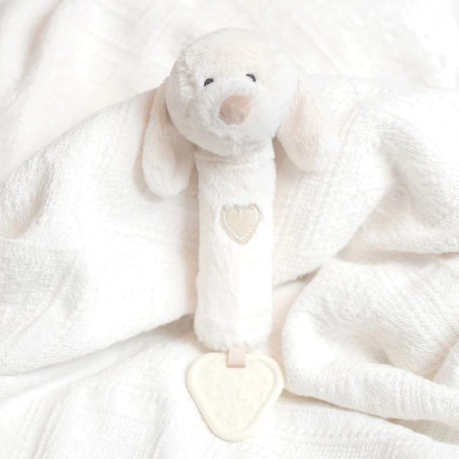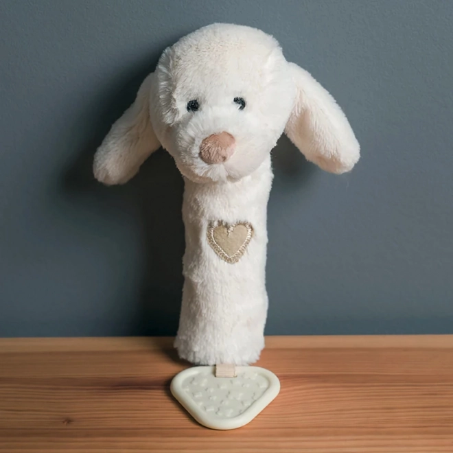 Dit veelzijdige, zachte hondje biedt kinderen drie ervaringen in één: zacht gerammel ter stimulatie van het gehoor, een leuke piep bij het indrukken en een getextureerde bijtring voor verlichting bij doorkomende tandjes. De neutrale natuurtint past in elke uitzet.
