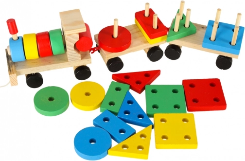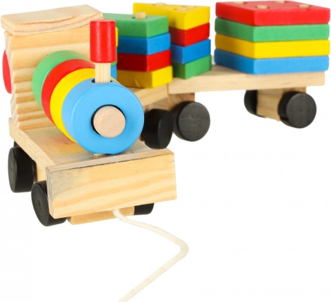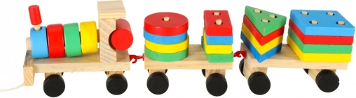 Deze kwalitatieve houten trein combineert plezier en leren in één. Dankzij de kleurrijke blokken en het stapelen op pinnen ontwikkelen kinderen hun fijne motoriek, oog-handcoördinatie en creativiteit. Het speelgoed helpt bovendien bij het herkennen van vormen en kleuren en stimuleert geduld en logisch denken.
