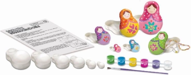 Elk van de 6 houten poppetjes past stap voor stap in elkaar, zodat je een bonte set traditionele Russische poppetjes maakt met een moderne, persoonlijke stijl. Een geweldig idee voor een cadeau en een gezellige familie-activiteit.