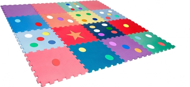 Levende kleuren en vormen (stipjes, ster) stimuleren de zintuigen en ondersteunen de ontwikkeling van fijne en grove motoriek. De foam dempt schokken en beschermt tegen kou van de vloer.