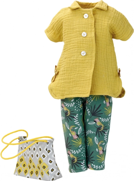 Groene broek met motieven van tropische planten en vogels geeft de pop een frisse en speelse look. De print past prachtig bij de okerkleurige blouse.