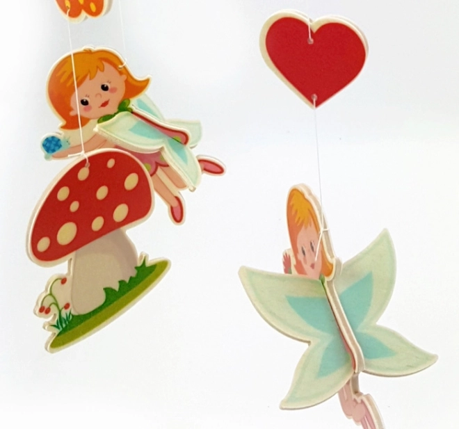 De hangende mobiel met feeënthema is niet alleen decoratief, maar ook functioneel in de kinderkamer. Hij is ontworpen om kinderen visueel te stimuleren en rust en vreugde te brengen tijdens hun rust of slaap.