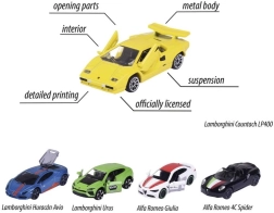 In de verpakking vindt u een selectie legendarische voertuigen: ALFA ROMEO 4C Spider, LAMBORGHINI Countach LP 400, LAMBORGHINI Huracán Avio, LAMBORGHINI Urus en ALFA ROMEO Giulia. Dankzij de scharnierende delen en de functionele vering is de rit soepel en realistisch. Perfect voor kinderen vanaf 3 jaar en als stijlvolle aanvulling op een verzameling.
