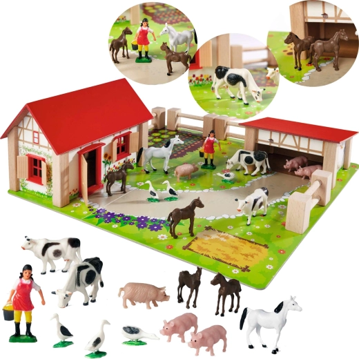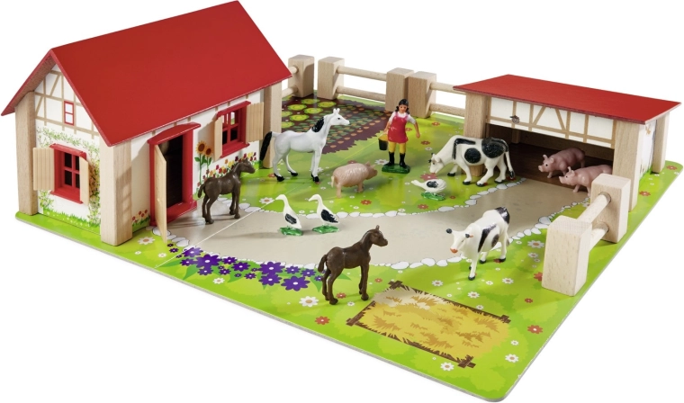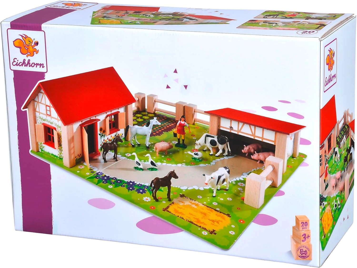 De EICHHORN houten boerderij zal elke kleine boer of boerin verheugen. De set bevat een huisje met rood dak, een stal, hekken en gedetailleerde dierenfiguren, waaronder paarden, koeien, biggetjes en ganzen. Er is ook een kleurrijke mat met wegen en een tuintje die kinderen gemakkelijk aanzet tot het maken van eigen scènes en verhalen. De solide houten constructie en duurzame materialen zorgen voor een lange levensduur en veilig spel.