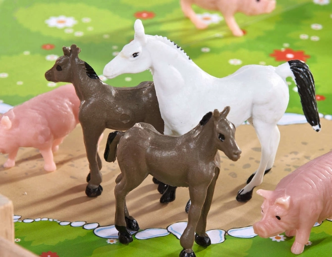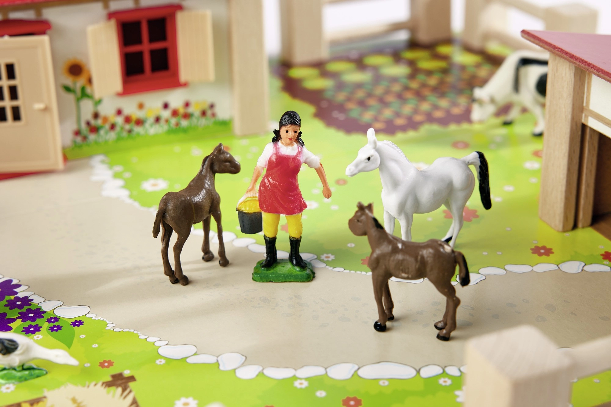 De mat met wegen, gras en moestuin en koppelbare hekken maken het eenvoudig om weides te bouwen en eigen boerderijverhalen te creëren.