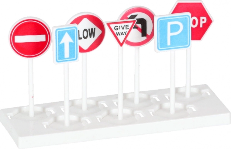 Transportvliegtuig, 3 bouwvoertuigen (graafmachine, betonmixer, bulldozer), 7 verkeersborden