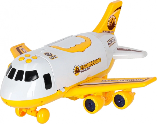 Groot transportvliegtuig voor kinderen dat drie bouwmachines en een set verkeersborden aan boord meeneemt. Heeft een openslaande laadklep, zijtoegang, LED-lichteffecten en realistische geluiden bediend met vier knoppen. Dankzij de afneembare vleugels en de praktische draaggreep is het eenvoudig te vervoeren en op te bergen.