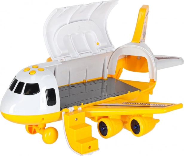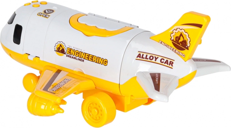 Bouw een complete bouwplaats en vervoer de machines rechtstreeks naar de locatie! Het robuuste vliegtuig met uitklapbare achterklep en zijopening maakt gemakkelijk laden en hanteren van de voertuigen mogelijk. Bij het indrukken van de knoppen gaan knipperende LED’s op de vleugels en onder de cockpit branden en starten realistische geluidsignalen.