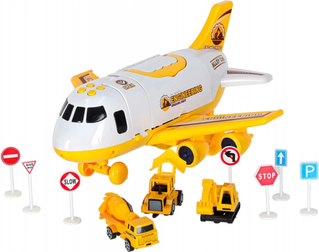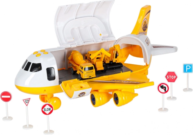 Inclusief drie gele bouwvoertuigen – graafmachine met beweegbare arm, betonmixer en bulldozer – plus 7 verkeersborden. Alles past in het vliegtuig. De speelset heeft afneembare vleugels om ruimte te besparen en een handgreep voor gemakkelijk dragen.