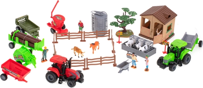 - Uitklapbare stal, 2 tractoren, 3 aanhangers/opbouwen (bijv. zaaimachine, balenpers, aanhanger voor balen), silo, boom, 8 houten hekkelementen, 8 verbindingsstukken (bases) voor de omheining, 6 baksteenelementen, voederbak/drinkbak, boerenfiguurtjes, dieren, waarschuwingsborden en andere accessoires