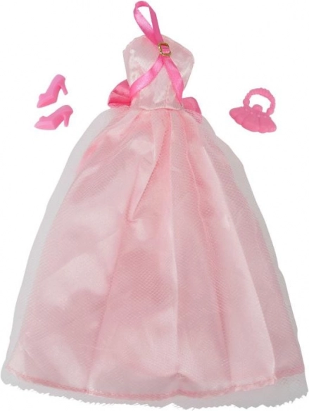 De jurk wordt geleverd met bijpassende hoge hakken en een handtas, die de elegante set voor de pop aanvullen.