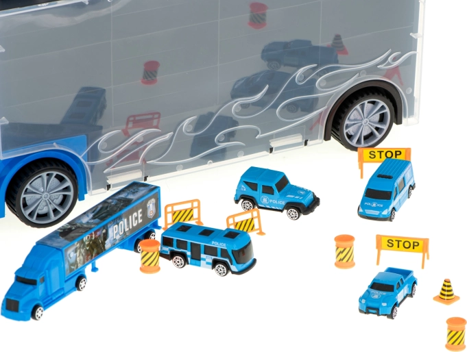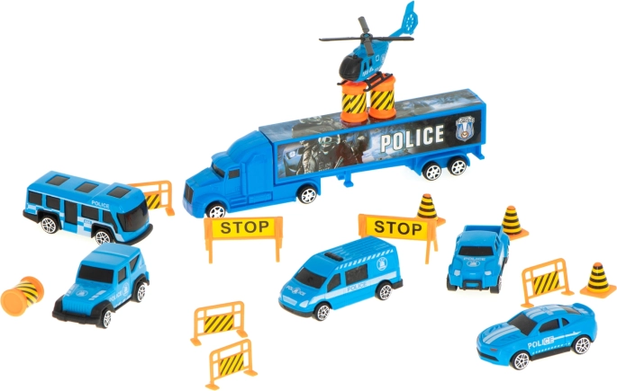 De set bevat 6 gedetailleerde metalen politieauto’s en een helikopter, aangevuld met verkeerselementen voor spannende scènes. De transporter biedt plaats aan tot 26 autootjes, dus er is genoeg ruimte voor extra verzamelstukken.