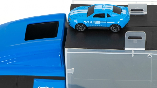 Deze robuuste politietransporter combineert speelplezier, orde en mobiliteit. Transparante vakken en te openen zijdeuren houden de hele verzameling netjes op zijn plaats, terwijl de geïntegreerde voorlanceerder een autootje rechtstreeks de actie in schiet. Dankzij de slimme handgreep verandert de truck in een koffer die kinderen gemakkelijk meenemen naar de speeltuin of naar oma.