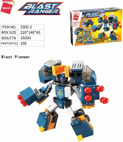 Met de Qman Blast Ranger beleven kinderen filmische actie. De krachtige auto verbergt een robotwachter die klaarstaat om de bemanning te beschermen. Dankzij de slimme constructie kan het model worden getransformeerd zonder te demonteren, wat zorgt voor vloeiend speelplezier en meer verhalen.