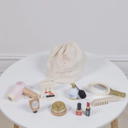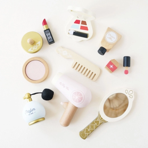 Spiegeltje, lippenstift, parfum, crème, oogschaduw met applicator, poeder met poederdons, nagellak, kwastje, föhn, kam en textielen zak – alles voor realistisch spel.