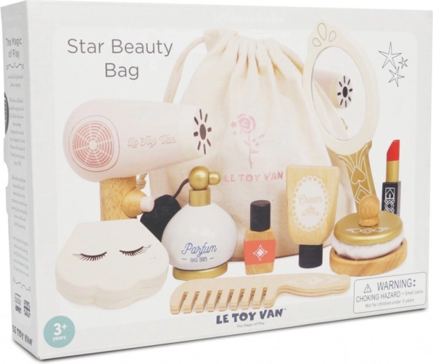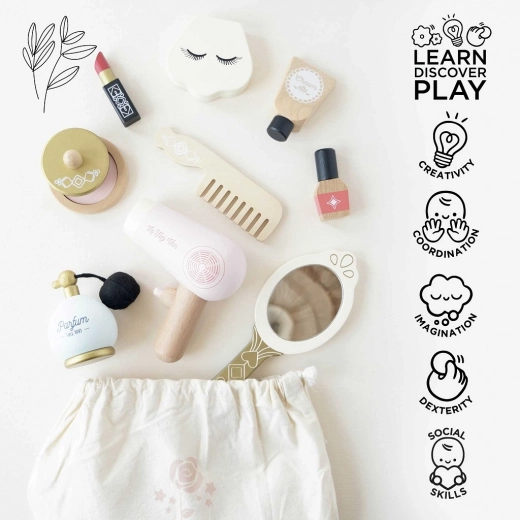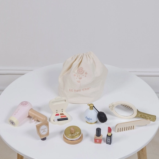Een stijlvolle cosmetische tas voor kleine visagisten van Le Toy Van, voor veilige en creatieve speelpret. Bevat houten accessoires van FSC®-hout, met de hand afgewerkt met niet-giftige verf op waterbasis. Perfect voor rollenspel en het ontwikkelen van fijne motoriek, verbeeldingskracht en communicatie. De praktische textielen zak houdt alles netjes bij elkaar, thuis en onderweg.