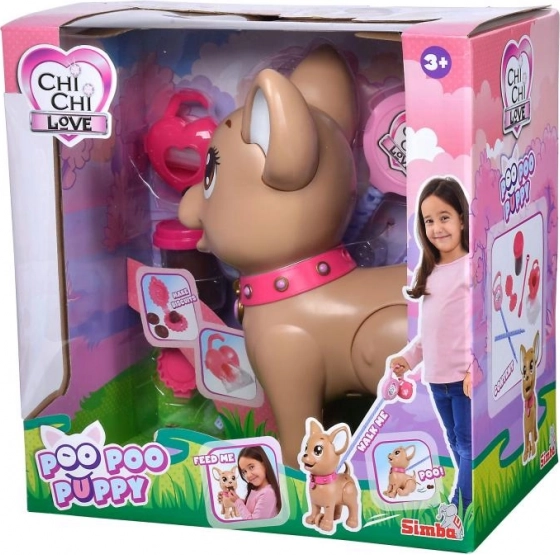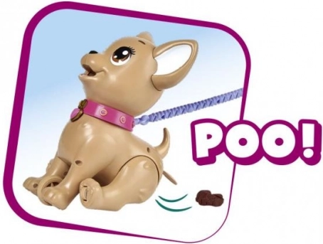 De interactieve chihuahua Poo Poo van CHI CHI LOVE biedt kinderen realistisch en tegelijk veilig speelplezier rond het verzorgen van een huisdier. Maak een traktatie van klei, voer het hondje en ga op pad – na een zachte druk op de riem buigt het hondje de achterpootjes en doet een hoopje, dat eenvoudig kan worden opgeruimd met de meegeleverde zakjes.