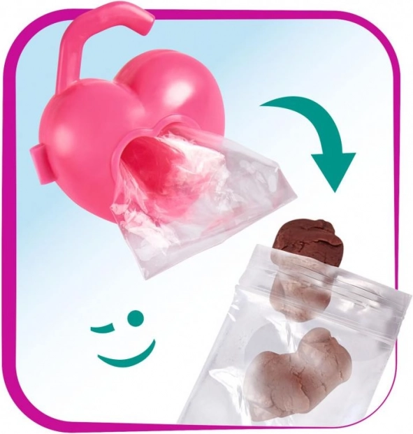 De set bevat een riem, klei, vorm en een hartvormig doosje met zakjes – alles wat een kleine verzorger nodig heeft.