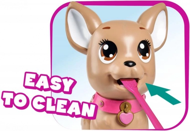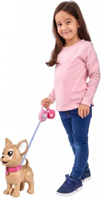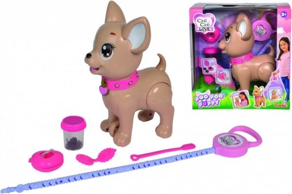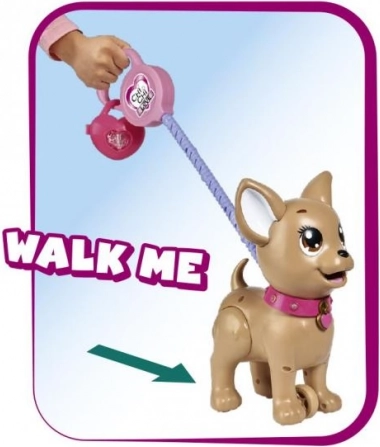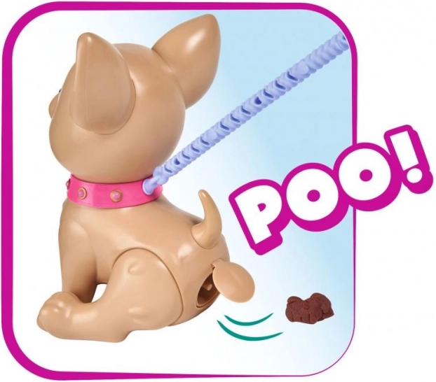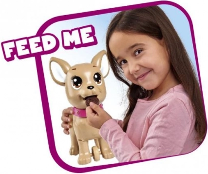 Een schattige interactieve chihuahua uit de CHI CHI LOVE-collectie leert kinderen op speelse wijze voor een huisdiertje te zorgen. Voer hem met klei, ga een wandeling maken en met een lichte druk op de riem doet hij een hoopje. Inclusief riem, klei, vorm en een hartvormig doosje met zakjes voor makkelijk opruimen. De hond is ongeveer 20 cm groot.