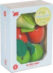 Zes stuks fruit met vilten blaadjes in een houten kistje met handgrepen. Ideale grootte voor kleine kinderhanden en boordevol thematisch speelplezier.