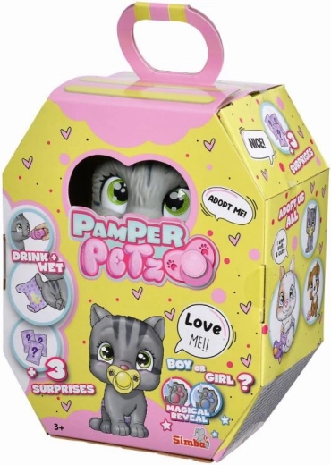 Het kitten PAMPER PETZ is het perfecte huisdier voor kinderen die plezier beleven aan de magie van adoptie en verzorging van een klein speelgoed. Het speelgoed kan echt water uit een flesje drinken en vervolgens plassen in de luier die van kleur verandert als deze nat is. Het magische pootje geeft aan of het kitten een jongen of meisje is.