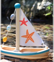 Dit hoogwaardige waterspeelgoed van Small Foot geeft kinderen plezier van vrij spel in en buiten het water. De houten romp met glad oppervlak en het stoffen zeil met zeesterrenmotief zorgen voor veilig gebruik en een aantrekkelijke uitstraling. De drijvende constructie is ideaal voor in bad, bij het zwembad of voor zomers waterplezier in de natuur.