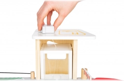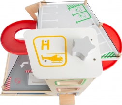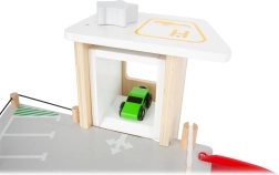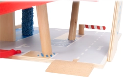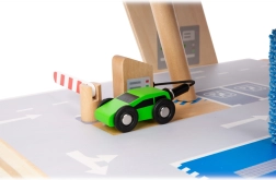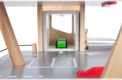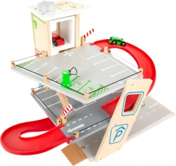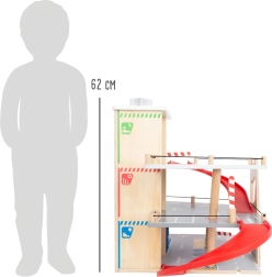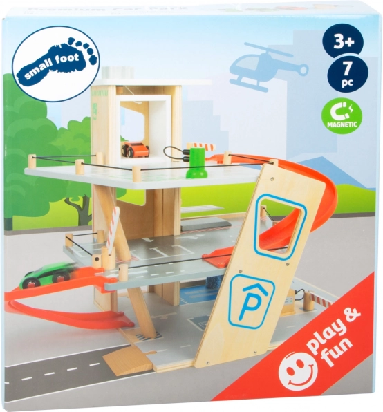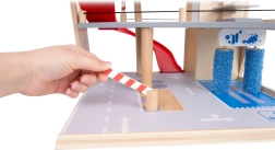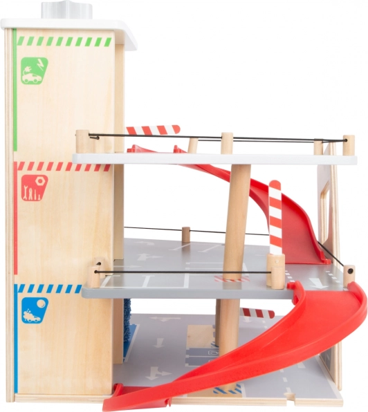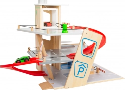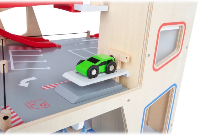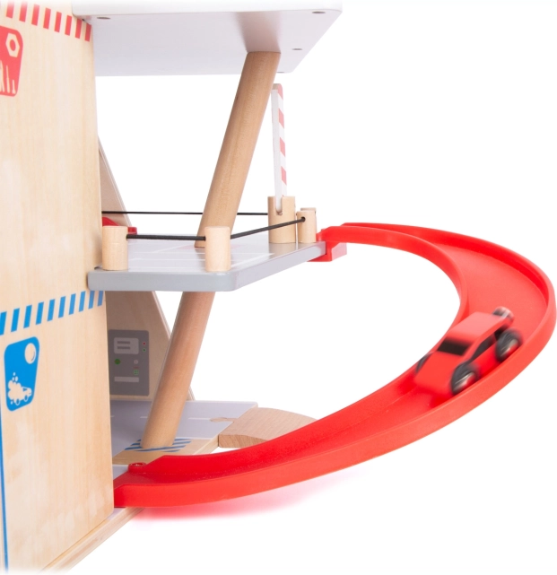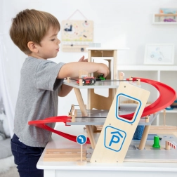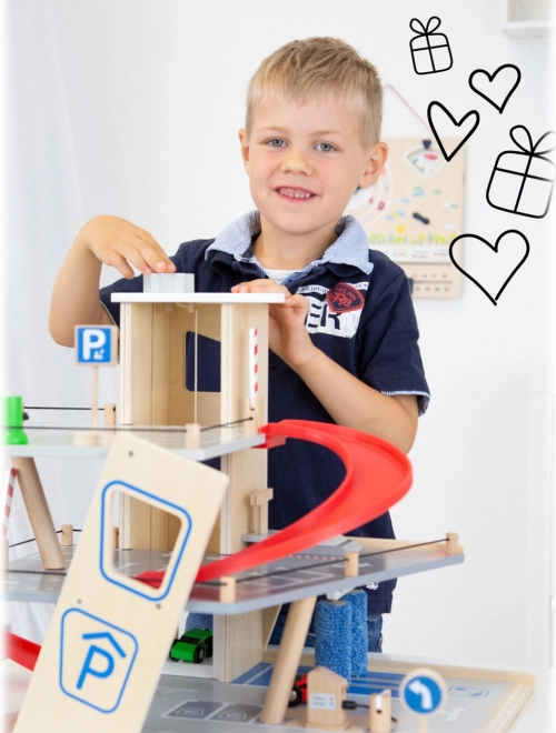 Deze premium parkeergarage van hoogwaardig houten multiplex biedt drie rijk uitgeruste niveaus die met een werkende lift en twee soepele hellingen zijn verbonden. Kinderen kunnen parkeren, tanken, opladen, wassen en repareren – alles op één plek, met realistische elementen en uitstekend speelplezier.
