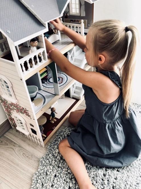 Het poppenhuis heeft een lichte buitenkant, een modern ontwerp en functionele elementen zoals schuifdeuren en open ramen.