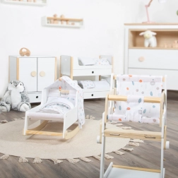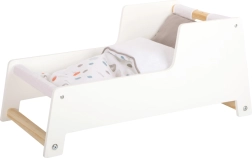 Inclusief dubbelzijdig, neutraal afgestemd beddengoed en een grote deken waaronder poppen of knuffels tot 46 cm comfortabel passen. Zachte kleuren en minimalistische lijnen maken er een smaakvolle aanvulling op elk interieur van, en ondersteunen creatief en imiterend spel.