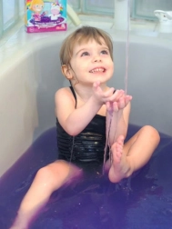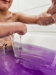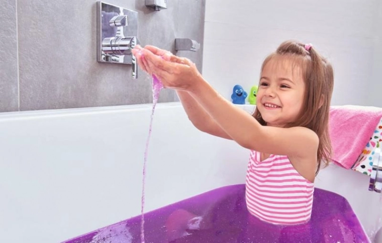 Glibbi verandert het bad in paars glinsterend slijm, wat kinderen een geheel nieuwe beleving van het dagelijkse baden geeft.