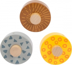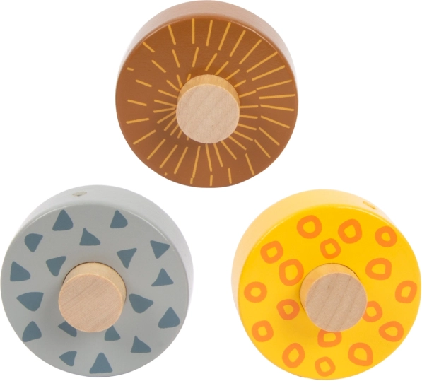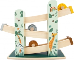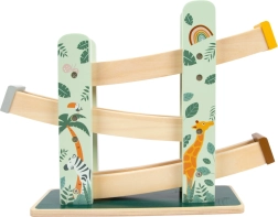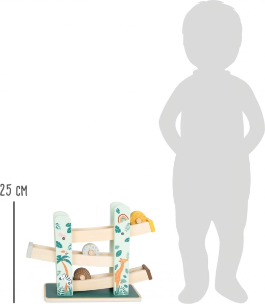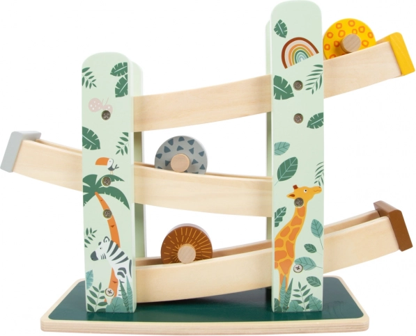 Deze prachtige houten racebaan biedt kinderen de mogelijkheid om te zien hoe drie wielen, elk met een uniek ontwerp, naar beneden rollen over de drie hellingen. Versierd met illustraties van safari-dieren en jungleplanten.