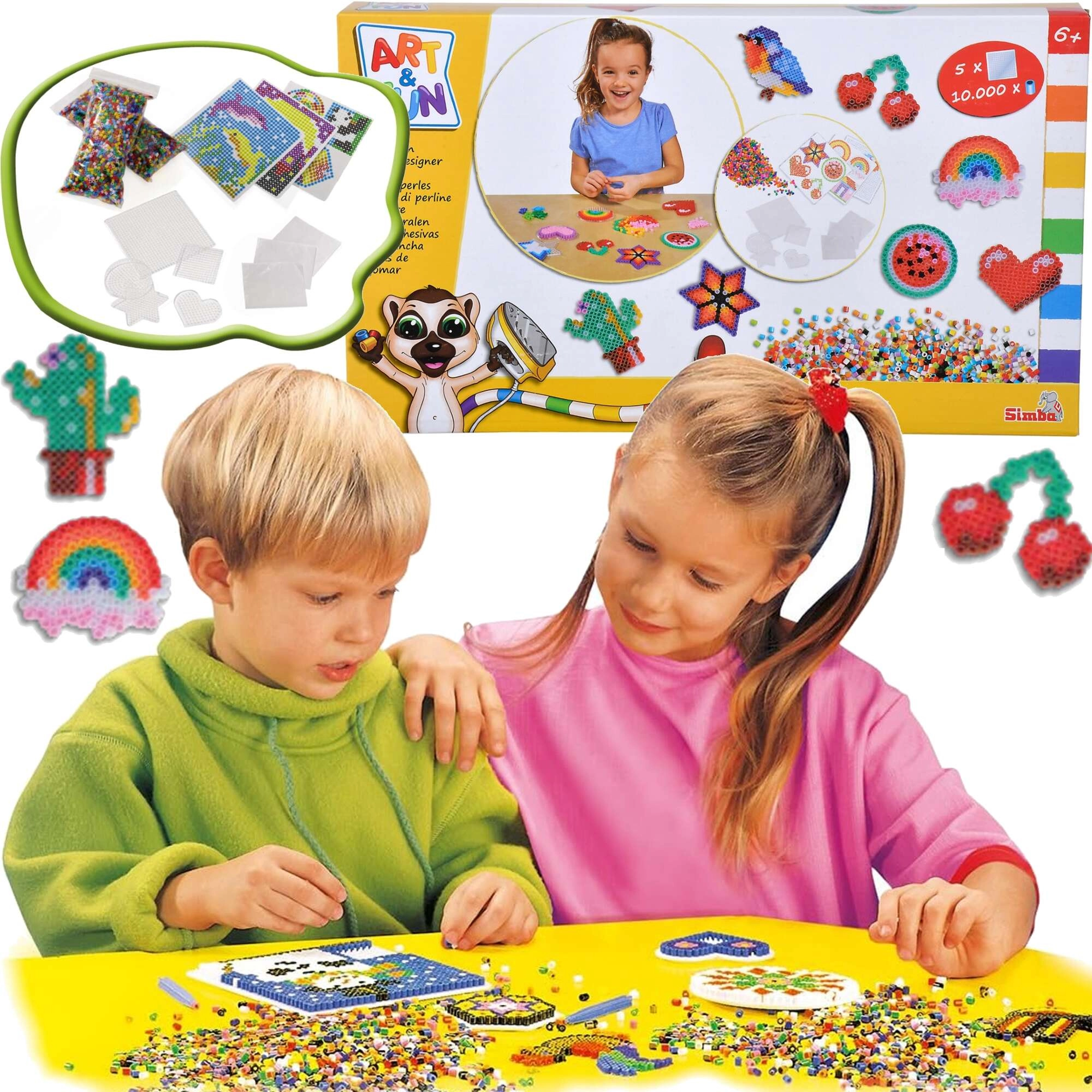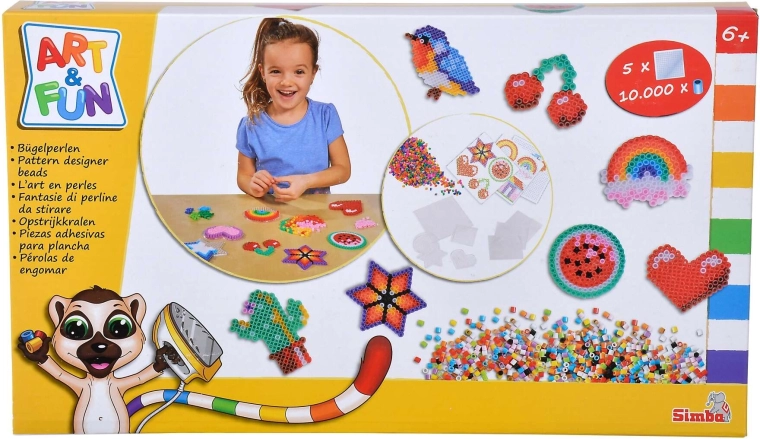 Ontdek de wereld van pixelcreaties met de strijkkralenset ART & FUN van SIMBA. In de doos vind je 10.000 gekleurde kralen en 5 herbruikbare onderplaten waarop je allerlei motieven legt. Na afdekken met bakpapier en strijken door een volwassene versmelten de kralen en worden ze hard tot een blijvende decoratie.